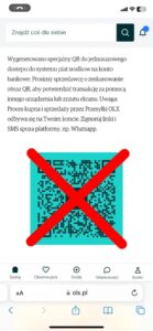 Przykłady fałszywych kodów QR19 sierpnia 2024Napisał OLX Po zeskanowaniu przesłanego przez oszusta kodu QR zostaniesz przekierowany do fałszywej strony, za pomocą której może dojść do wyłudzenia Twoich danych.